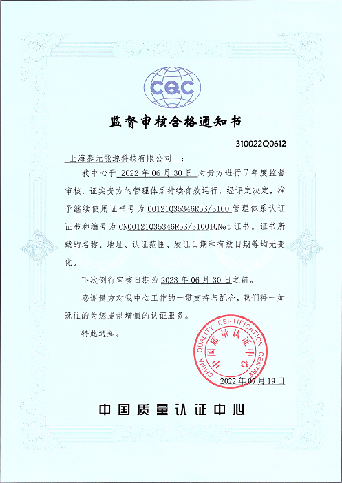 秦元公司顺利通过中国质量认证中心的CQC年度监督审核